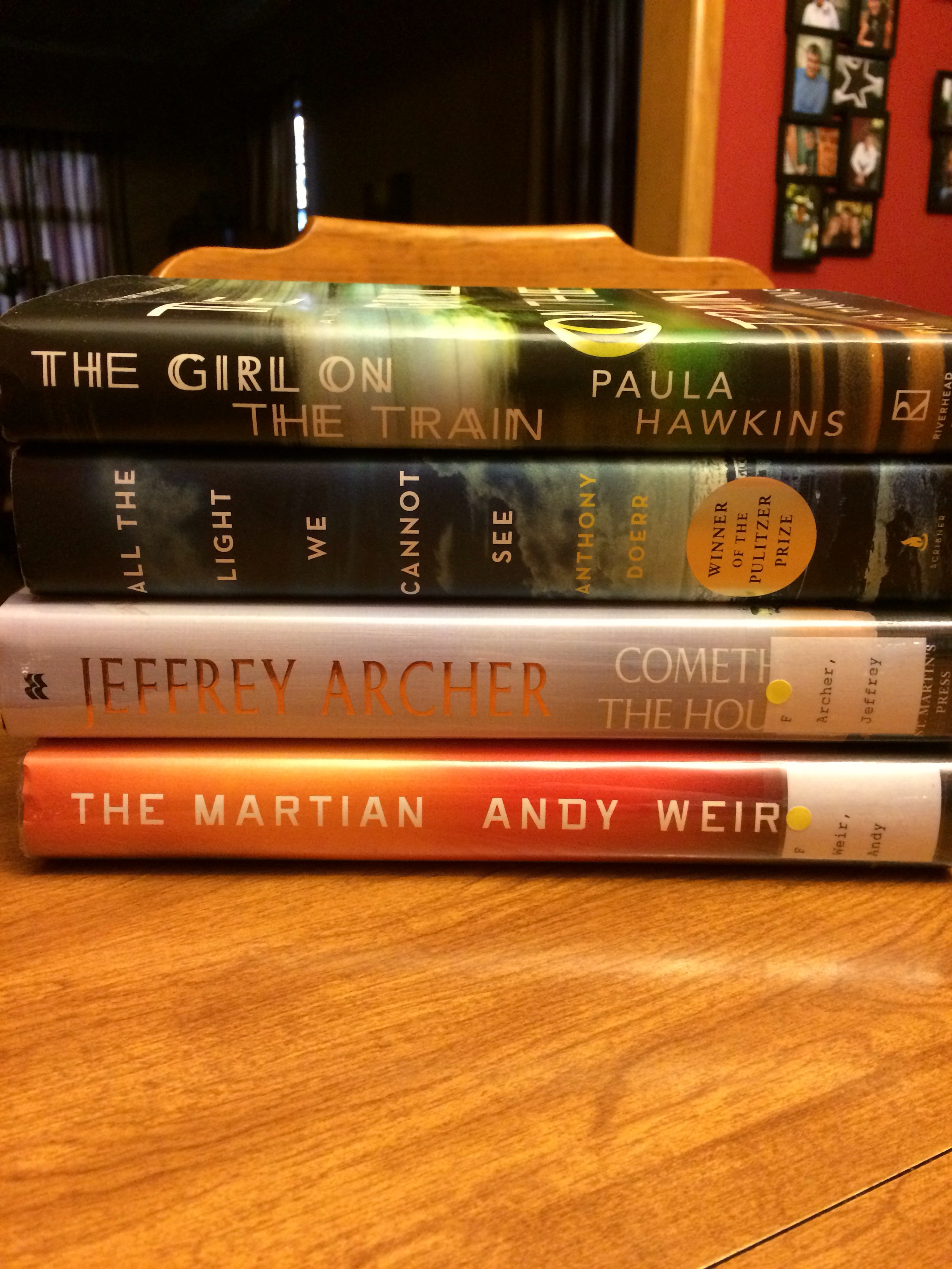I am currently reading The Girl on the Train. Then my man Jeffrey is up (I love me some Jeffrey Archer–my favorite book by him is As the Crow Flies) followed by The Martian. I am not all in on The Martian but I will give it my best shot. All the Light We Cannot See is last because it’s for my Old Lady Book Club on April 4 so it needs to be fresher in my mind.
